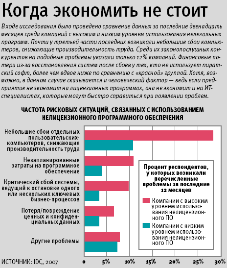 Почти у третьей части последних возникали небольшие сбои компьютеров, снижающие производительность труда. Среди их законопослушных конкурентов на подобные проблемы указали только 12% компаний. Финансовые потери из-за восстановления систем после сбоев у тех, кто не использует пиратский софт, более чем вдвое ниже по сравнению с «красной» группой. Хотя, возможно, в данном случае сказывается и человеческий фактор — ведь если предприятие не экономит на лицензионных программах, она не экономит и на ИТ-специалистах, которые могут быстро справиться при появлении проблем.