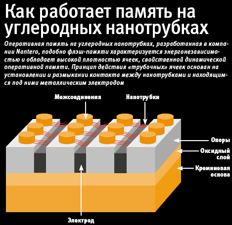 Компания Nantero сумела изготовить кремниевую подложку с размещенными на ней ячейками памяти на углеродных нанотрубках, используя стандартные для полупроводниковых производств технологических процессов. Таким образом, можно говорить об преодолении очень серьезного барьера на пути коммерческого применения экзотической пока технологии памяти NRAM (non-volatile RAM), которая в перспективе должна прийти на смену микросхемам DRAM, SRAM и флэш-памяти.