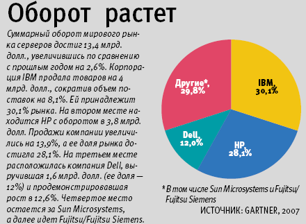 HP, сохранившая за собой общее лидерство по количеству выпущенных серверов, сумела увеличить поставки на 20,2% и контролирует сегодня 29,3% серверного рынка. Следом за ней идет Dell — поставки 5,4%. На третьем месте находится IBM. Ее поставки сократились на 3,9%. Далее следуют Sun и Fujitsu/Fujitsu Siemens.