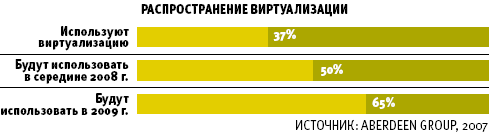 По данным Forrester Research, уже около трети предприятий внедрили виртуализацию серверов платформы x86, а к 2009 году их количество превысит две трети. В подразделениях ИТ, уже применяющих виртуализацию, она внедрена в среднем на 24% серверов. Согласно прогнозам, к 2009 году их будет уже 45%. В Forrester считают, что вендорам следует поторопиться с модернизацией продуктов виртуализации, поскольку заказчики готовы активно внедрять эту технологию. Предприятия уже пару лет работают с виртуализацией, и теперь они готовы перейти от экспериментов к стратегическим инфраструктурным инициативам, что может потребовать модернизации серверов, сетевого оборудования и средств управления системами. Пока что виртуализация практически не касается критически важных приложений и высокопроизводительных вычислений.