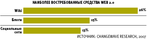 Четверть компаний, опрошенных ChangeWave Research, используют в своем бизнесе средства Web 2.0 и еще 8% планируют начать их использование в течение ближайшего года. В целом почти половина респондентов отметила, что использование «социального» ПО может принести пользу компании. Что характерно, ни в одной из компаний, использующих Web 2.0, не собираются сокращать инвестиции в эту область. Это дает аналитикам возможность говорить о грядущем взрывном росте этого рынка. Наиболее востребованными средствами являются онлайн-энциклопедии (Wiki), блоги и социальные сети. Подавляющее большинство пользователей отмечают, что прилагаемые усилия действительно помогают сделать более комфортным внутреннее общение сотрудников и улучшить процессы совместной работы.