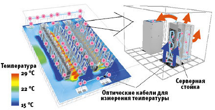 Как пояснил Фумио Такеи, научный сотрудник Fujitsu, работающий над этой системой, по кабелю, проложенному по центру обработки данных и через серверные стойки, посылаются световые импульсы, после чего измеряется время возвращения света обратно по линии с учетом эффекта комбинационного рассеяния.