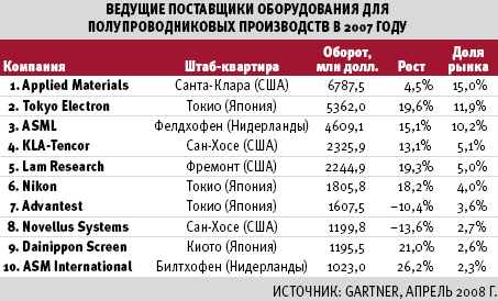 Мировой рынок оборудования для полупроводниковых производств, по данным Gartner, в 2007 году вырос на 5,9% по сравнению с позапрошлым годом и составил 44,5 млрд долл. 15% этой суммы вновь пришлось на долю поставщика номер один — Applied Materials. Объем продаж этой компании вырос, правда, всего лишь на 4,5%. Как следствие, доля рынка Applied Materials немного сократилась. Но отрыв американской корпорации от ближайшего конкурента в лице японской компании Tokyo Electron по-прежнему остается внушительным — почти 1,5 млрд долл. Всего в первой десятке рейтинга Gartner фигурируют по четыре американских и японских компании, а также две голландские.