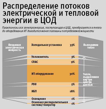 Как утверждают в APC, интегрированный подход к организации системы электропитания и охлаждения в ЦОД дает возможность сократить потребление электроэнергии на 20-30% без дополнительных расходов. По мнению старшего вице-президента APC Нейла Расмуссена, применение модульной, масштабируемой архитектуры электропитания и охлаждения позволяет повысить эффективность энергопотребления на 10-30%, виртуализация серверов дает выигрыш 10-40%, еще 4-10% можно сэкономить за счет более эффективных систем питания (например, применения современных моделей ИБП), правильной организации пространства под фальшполом и размещения кондиционеров, а грамотно спроектированные системы кондиционирования с экономичными режимами работы дают экономию в 7-15%. Например, система охлаждения InRow (кондиционер устанавливается сбоку от стойки с оборудованием), располагаясь непосредственно рядом с источником тепла, позволяет организовать эффективный теплоотвод и повысить показатели готовности ЦОД в целом, не требует осушения или увлажнения воздуха, применения фальшпола.