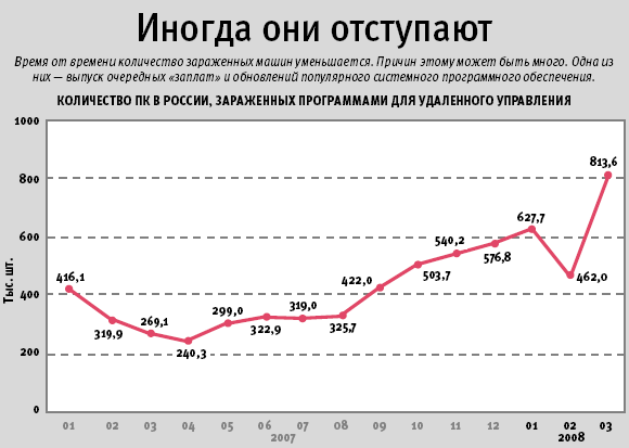 Количество зараженных ПК, по данным Trend Micro, не растет монотонно. В январе их было почти 630 тыс., в феврале — всего 462 тыс. Схожая картина — и в прошлом году. Чем объясняются периодические спады числа зараженных компьютеров?