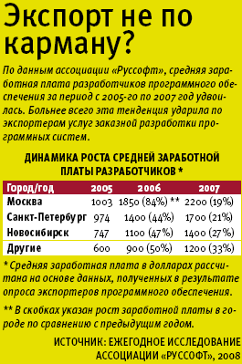 Совокупная экспортная выручка аутсорсинговых компаний пока больше. Она достигла 1270 млн долл., но темпы ее роста меньше — 52%. По некоторым данным, экспортные доходы «продуктовиков» значительно выше оценок «Руссофта» и превышают 800 млн долл. Однако общая тенденция в любом случае не в пользу аутсорсинга.