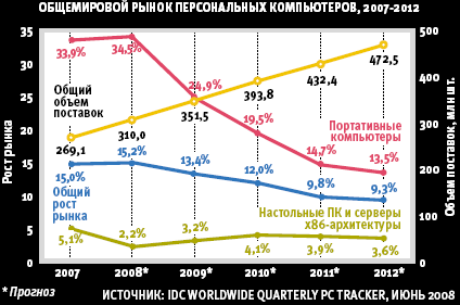 Аналитики IDC представили уточненный, более оптимистичный прогноз рынка персональных компьютеров на период с 2007-го по 2012 год. (В IDC в это понятие включают настольные, мобильные и ультрамобильные компьютеры, а также серверы x86-архитектуры, но не включают КПК.) Общая стоимость проданных в этом году компьютеров составит, по прогнозам IDC, 286 млрд долл., что на 9,6% выше прошлогоднего, а к 2012 году достигнет примерно 354 млрд долл.