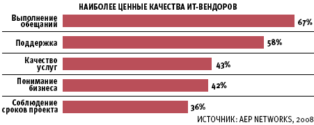 Двое из трех ИТ-директоров главным достоинством поставщиков ИТ-продуктов и услуг считают способность выполнять данные обещания. По данным CIO.com, именно этот критерий и становится решающим при выборе вендора и продлении контракта с ним. Еще 58% утверждают, что важным фактором их лояльности является качественная поддержка внедренного решения. Интересно, что менее 36% акцентируют свое внимание на сроках реализации проектов. Судя по всему, выход проекта за временные (а зачастую — и бюджетные) рамки является для компаний вполне привычным явлением, с которым готовы мириться.