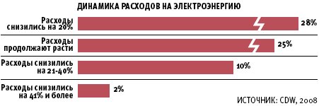 По данным опроса компании CDW, лишь 34% руководителей ИТ-подразделений считают энергоэффективность важным фактором при принятии решения о покупке оборудования ИТ. В то же время 94% опрошенных утверждают, что принимают меры по снижению энергозатрат. 57% руководителей отмечают, что по крайней мере один специалист в их организации отвечает за затраты на электроэнергию. Почти 90% разрабатывают стратегии управления потреблением электроэнергии. Одна лишь покупка энергоэффективного оборудования проблем не решает. Например, только 38% организаций, которые приобрели компьютеры, сертифицированные по стандартам Energy Star, полностью используют заложенные в них возможности экономии электроэнергии. В опросе участвовали 778 ИТ-профессионалов из США, включая средние и крупные компании, государственные и образовательные учреждения.