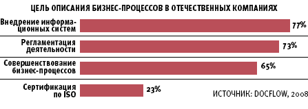 Концепцию BPM в той или иной форме использовали около 80% опрошенных. Особенность европейского рынка BPM состоит в том, что основная тенденция направлена не столько на описание, сколько на анализ бизнес-процессов. Интересно, что, говоря о результатах применения процессного подхода в управлении, лишь 10% компаний считают, что пока не получили от него фактической отдачи. Более 40% настроены весьма оптимистично и заявляют, что полностью оправдали свои ожидания от BPM. В России же картина в сфере управления бизнес-процессами является гораздо менее привлекательной. Как показал опрос участников выставки Docflow 2008, наиболее массовыми — в силу дешевизны и простоты использования — инструментами для описания бизнес-процессов служат Microsoft Visio и Microsoft Office. С помощью этих инструментов-«рисовалок» можно описать процессы, однако задачи управления процессами с их помощью не решаются.