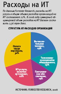 Совокупный объем расходов организаций всего мира на ИТ составил в 2007 году, по оценке Forrester, 2,19 трлн долл.; прогноз на текущий год — 2,36 трлн долл. Из этих денег приблизительно 19% расходуется на вычислительную технику, 15% — на оборудование связи и передачи данных, 14% на программное обеспечение, 22% на ИТ-услуги, включая аутсорсинг, и 30% — на оплату труда собственного персонала. В Восточной Европе, на Ближнем Востоке и в Африке суммарный объем расходов на ИТ составил в 2007 году 108 млрд долл.; прогноз на 2008 год — 126 млрд долл. Здесь структура затрат такова: 19-20% на вычислительную технику, столько же на телекоммуникационное оборудование, всего 9% на программное обеспечение, по 26% на ИТ-услуги, включая аутсорсинг, и на оплату труда.