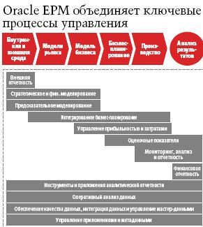 Модуль внешней отчетности поддерживает процесс взаимодействия с заинтересованными сторонами. Модули стратегического и финансового, а также предсказательного моделирования поддерживают, помимо вышеназванного процесса, этапы модельного анализа рынка и бизнес-моделирования. Процессы от модельного анализа рынка до производства поддерживаются модулем интегрированного бизнес-планирования. Процессы бизнес-планирования и производства используют модуль управления прибыльностью и затратами. Участок от бизнес-планирования до анализа результатов задействует модуль оценочных показателей. Средства мониторинга, анализа и отчетности охватывают два последних участка цикла деловой активности — производство и анализ результатов. Последний этап задействует модуль финансовой отчетности. И наконец, поддержку всех семи этапов осуществляют модули управления приложениями и метаданными; обеспечения качества данных, интеграции данных и управления мастер-данными; оперативного анализа данных; инструменты и приложения аналитической отчетности.