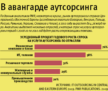 Рынок ИТ-аутсорсинга в странах Центральной и Восточной Европы в 2008 году составил около 3 млрд евро и вырос по сравнению с 2007 годом на 25%. Важную роль в этом процессе сыграла Россия: она аккумулирует около 40% объема рынка региона. По прогнозам консалтинговой компании PMR, в течение следующих двух лет рынок аутсорсинга значительно притормозит свой рост, хотя и будет себя чувствовать гораздо лучше, чем ИТ-рынок в целом. Наибольший вклад в его развитие должны внести организации финансового сектора, а также телекоммуникационные и торговые компании.