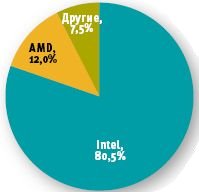 Рыночная доля Intel увеличивалась ежеквартально, и в IV квартале 2008 года в денежном выражении составила 81,8%, что на 0,88% больше показателя III квартала (80,96%). Эксперты частично связывают успех Intel с хорошими продажами процессоров Atom для нетбуков, популярность которых росла весь год. Однако основная доля выручки была сформирована процессорами для ноутбуков, десктопов и серверов. Рыночная доля компании AMD в четвертом квартале сократилась по сравнению как с предыдущим кварталом, так и c аналогичным периодом 2007 года — на 1,6% и 3,5% соответственно. По итогам всего года доля Intel на мировом рынке процессоров в денежном выражении увеличилась на 1,6%, до 80,5%. Доля AMD сократилась на 1,1%, до 12%. Сократилась объединенная доля и всех других поставщиков — на 0,4%, до 7,5%. Аналитики объясняют сокращение доли AMD тем, что компания не выполнила ряд стратегических инициатив, например по сокращению производственных мощностей. Кроме того, AMD игнорирует феноменальный успех нетбуков.