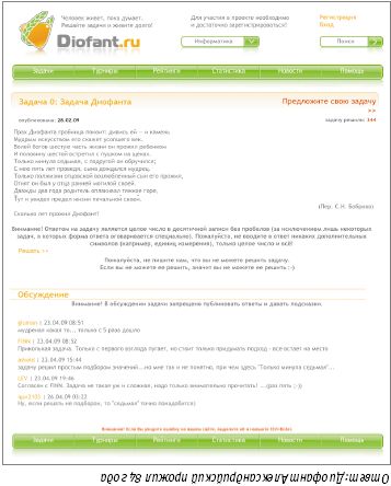 Проект «Диофант» (www.diofant.ru) создан специально для тех, кто решил этот процесс ускорить. Древнегреческий математик Диофант подарил потомкам знаменитую «Арифметику». В его книгах впервые встречаются рациональные и отрицательные числа, появляются уравнения с символьными обозначениями для неизвестных переменных. На работах великого математика выросло не одно поколение ученых. Новый Internet-ресурс, созданный усилиями Интернет-университета информационных технологий (www.intuit.ru) и издательства «Открытые системы», посвящен решению задач по математики и информатики различной степени сложности. Девиз проекта — «Человек живет, пока думает».