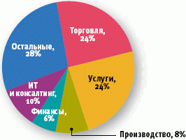 Такой существенный рост говорит о безусловной востребованности со стороны рынка решений, ориентированных на взаимодействие с клиентами. При этом количество завершенных проектов увеличилось лишь для 13 CRM-систем из 24 постоянно и активно внедряющихся на рынке. Решения CRM наиболее активно внедрялись среди компаний сфер торговли и услуг, на двоих аккумулировавших почти половину осуществленных проектов. Далее с огромным отрывом следуют производственные и финансовые предприятия, а также консалтинговые и ИТ-компании.