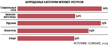 В результате во многих организациях попадает в черный список большинство популярных ресурсов. Как показало исследование, проведенное компанией ScanSafe, в первую очередь это касается социальных сетей. За последние полгода число компаний, относящих такие ресурсы к нежелательным, увеличилось на 20%. Сегодня в 76% организаций посещение социальных сетей в рабочее время не просто не одобряется руководством, но и пресекается на технологическом уровне. Другими распространенными объектами блокировки являются Internet-магазины, сайты, посвященные оружию и алкоголю, а также спортивные информационные ресурсы.