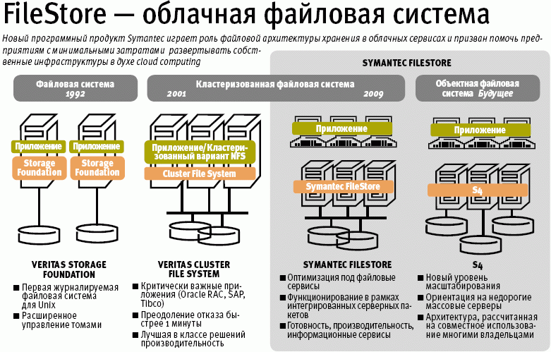 В то же время в Symantec сообщили, что новый программный продукт FileStore представляет собой инструментарий, способный помочь корпорациям создавать с минимальными затратами собственные инфраструктуры вычислений в облаке, используя стандартные серверы архитектуры x86, а также любую конфигурацию внутренних систем хранения, в том числе JBOD.