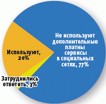 Большинство (82%) российских Internet-пользователей негативно относятся к введению платной регистрации в социальных сетях. Причем, если среди взрослых (старше 30 лет) участников преобладают сдержанные оценки «скорее негативно», то молодежь (от 14 до 30 лет) чаще всего выражает свое отношение к платной регистрации как «очень негативное». В 75 случаях из 100 участники опроса заявляли, что не готовы рассматривать вариант регистрации в социальной сети за деньги: 43% участников опроса утверждают, что «категорически не готовы» платить, а 32% предполагают, что «скорее не готовы». Лишь 5% респондентов не исключают для себя возможности зарегистрироваться в социальной сети за деньги.