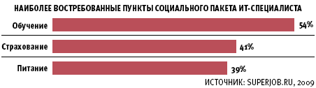 Повышать свой профессионализм хотели бы 54% ИТ-специалистов. Они прекрасно понимают, что таким образом есть возможность повысить свою стоимость на рынке труда. Другими популярными ингредиентами «идеального» компенсационного пакета стали оплаченный полис добровольного медицинского страхования и бесплатное питание. Ненормированный рабочий день, равно как и возможность удаленной работы, в пятерку наиболее популярных предпочтений не попали.