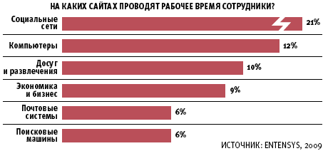 В частности, по данным Entensys, в полтора раза возросла посещаемость информационных порталов, а на 20% — использование личной почты. Посещаемость самой популярной категории «Социальные сети» практически не изменилась и составила 21%. Просуммировав данные по категориям, явно не связанным с работой, можно получить оценку нецелевого использования Internet в 55-60%. Как выяснилось, российские офисные работники по сравнению с западными в четыре раза чаще посещают социальные сети, в 12 раз больше используют личную почту. При этом они гораздо реже интересуются экономическими и деловыми новостями, равно как и образовательной тематикой.