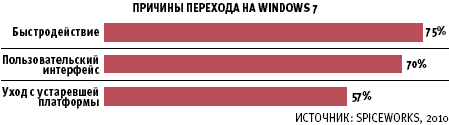 Как показало исследование, проведенное Spiceworks, 20% системных администраторов и других ИТ-специалистов небольших компаний планируют ускорить переход на новую операционную систему. При этом половина собирается сделать первые движения в этом направлении в течение трех ближайших месяцев. Очевидно, сегмент SMB настроен в отношении миграции решительнее, чем более крупные организации. Из тех, кто готов перейти на Windows 7, 75% назвали в качестве одной из причин прирост в скорости, а 70% упомянули улучшения в пользовательском интерфейсе.