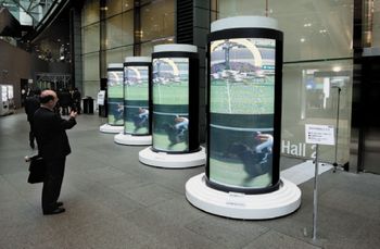 Благодаря эластичности дисплеев их можно монтировать на круглые тумбы и другие поверхности небольшой кривизны. Панель выполнена на основе массива газоразрядных ламп высотой по 1 мм. Лампы сгруппированы по три — в каждой группе присутствует излучатель красного, зеленого и голубого цвета. Благодаря тому что лампы установлены строго перпендикулярно поверхности дисплея, его можно слегка изгибать.
