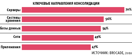 Причинами инвестиций в эту область являются повышение производительности сети, упрощение управления и, в конечном счете, увеличение эффективности бизнеса. Результаты исследования, проведенного компанией Brocade, показали, что большинство предприятий рассматривает консолидацию ИТ в числе трех самых приоритетных вопросов на ближайший год. При этом консолидация опережает по значимости такие направления, как виртуализация и информационная безопасность. Говоря об основных направлениях консолидации, 70% называют существующие серверы, 56% — системы хранения, а 54% — базы данных.В качестве самых больших трудностей компании называют разнообразие платформ и приложений.