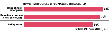 Время, необходимое для восстановления систем после сбоя, как минимум в два раза больше, чем предполагают во многих организациях. В ходе опроса, проведенного компанией Symantec, большинство ИТ-руководителей заявили, что в случае катастроф простой систем до полного восстановления составит два часа. Однако средняя продолжительность реального простоя систем в 2010 году составила пять часов. В среднем за последний год на одну организацию пришлось четыре вынужденных простоя из-за сбоев в ИТ-системах. Говоря о причинах сбоев, респонденты указали на обновления систем, перебои в подаче электроэнергии и кибератаки.