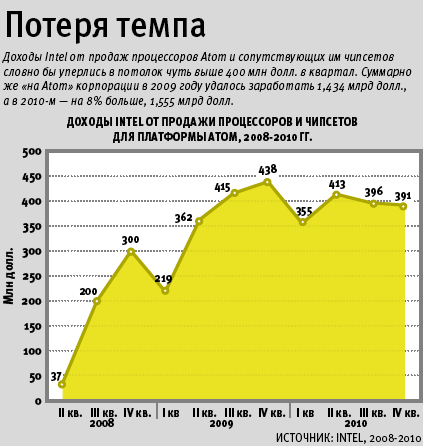 В том, что нынешний год будет непростым для процессорного семейства Intel Atom, сомневаться не приходится. Доходы Intel от продаж этих процессоров и сопутствующих им чипсетов словно бы уперлись в потолок чуть выше 400 млн долл. в квартал в конце 2009 года. Рынок нетбуков — привычная сфера применения Atom — сейчас переживает не лучшие времена, а проникновение на новые рынки сопряжено с немалыми сложностями, которые еще предстоит преодолевать. Логика дальнейшего развития процессорной платформы, очевидно, требует какого-то нового импульса. Вопрос в том, где его взять.