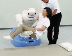 КОЛЕСНЫЙ РОБОТ-СИДЕЛКА RIBA-II, разработанный в компании Tokai Rubber Industries, своими мощными руками может бережно поднимать пациентов с кровати и усаживать их в инвалидное кресло, а также выполнять обратную процедуру. Робот создан для использования в домах престарелых, количество которых в Японии быстро растет. Робот выполняет самую трудную и утомительную часть работы персонала по уходу за престарелыми. По данным японских исследователей, сотрудникам домов престарелых приходится поднимать пациентов в среднем по 40 раз в день. Соблюдать осторожность роботу помогает покрытие из резиновой сенсорной сети на руках и груди, обеспечивающей обратную связь.