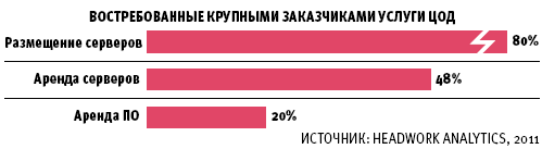 Как показало недавнее исследование Headwork Analytics, проведенное по заказу компании «Астерос», к 2015 году емкость российского рынка коммерческих ЦОД увеличится в два с половиной — три раза, при том что в сегменте крупных предприятий спрос на подобные услуги вырастет почти в пять раз. Даже с учетом роста предложения дефицит площадок проявится уже в 2012 году. На долю крупных заказчиков приходится 40% общего рыночного спроса, причем наиболее активными потребителями услуг являются медиахолдинги, транспортные и логистические компании, а также банки. Ретейл, энергетика и промышленность демонстрируют лишь умеренный интерес, а нефтегазовые компании потребности в услугах коммерческих ЦОД и вовсе не испытывают. Ключевыми услугами ЦОД остаются размещение серверов — этим сервисом пользуются 80% текущих клиентов — и аренда оборудования, востребованная среди 48% заказчиков. Модель SaaS используют менее 20% крупных клиентов.