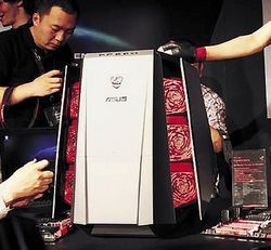 Компания ASUS представила настольную систему ROG Tytan CG8890 необычной конструкции и с расширенными возможностями для разгона. В ней используется система жидкостного охлаждения, при этом для ее максимального задействования надо нажать кнопку на корпусе — это приводит к раскрытию боковых панелей, за которыми расположены два ряда вентиляторов. Десктоп оснащен кнопкой разгона Turbo Gear, которая позволяет динамически разгонять шестиядерный процессор Intel Core i7-3960X без необходимости перезагрузки. Предусмотрено три режима разгона: Startup (при его активизации частота процессора составляет 3,8 ГГц, а логотип ROG и нижняя решетка светятся синим; Turbo Gear, когда частота процессора достигает 4,0 ГГц, а логотип ROG и нижняя решетка светятся красным; Turbo Gear extreme, также с красной подсветкой элементов и частотой процессора 4,2 ГГц.
