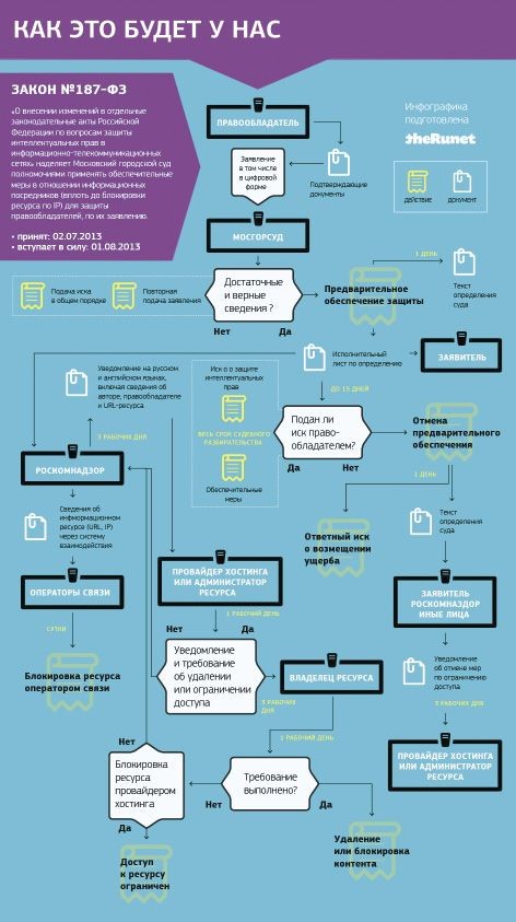 МЕХАНИЗМ ДЕЙСТВИЯ российского «антипиратского» закона достаточно сложен, поэтому портал theRunet при экспертной поддержке РАЭК расшифровал и изобразил в виде инфографики основные положения и алгоритмы блокировки контента, предписанные авторами законопроекта |