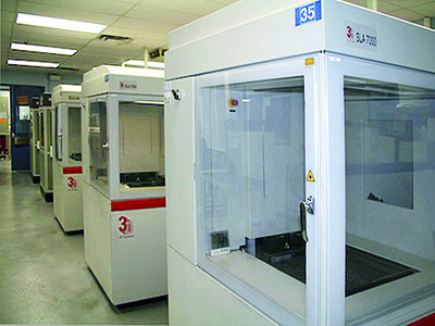 | Стереолитографические 3D-принтеры на предприятии Ford в Диборн-Хайтс. При помощи лазера SLA-принтеры формируют в фотореактивной смоле нужный шаблон. Под воздействием лазера смола затвердевает. SLA-принтеры обеспечивают самый высокий уровень точности компонентов, получаемых с помощью трехмерной печати |