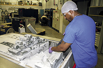 | После завершения процесса печати технолог Ford Лерон Джонс достает из блока песчаные литейные формы. Лишний песок удаляется с поверхности формы при помощи пылесоса. Прежде песчаные формы для производства прототипов металлических компонентов изготавливались в течение 10 недель. Сегодня за неделю только на одной машине можно получить сотни подобных форм |