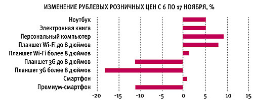 За ноябрь выросли рублевые цены почти на всю потребительскую электронику — максимальное повышение составило 11%, говорится в исследовании Департамента информационных технологий Москвы, результаты которого опубликовали «Ведомости». В долларовом эквиваленте средняя стоимость большинства видов устройств снизилась — ввиду постоянного обновления товарной линейки. Однако в силу зависимости от курса валют для конечного потребителя наблюдается повышение средней стоимости на популярные устройства, указано в исследовании. В среднем цена на планшеты с экраном до 8 дюймов с Wi-Fi выросла в долларовом эквиваленте на 1%, до 103 долл., в рублевом — на 15%, до 4861 руб. Цена на планшеты с экраном до 8 дюймов с Wi-Fi и 4G снизилась в долларах на 1%, а в рублях выросла на 5%, до 17 715 руб. Но есть группы товаров, которые дешевеют: например, стоимость компьютерных мышей снизилась на 30%. Такая тенденция касается тех устройств, стоимость производства которых снижается, а также очень дорогих новинок, которые по мере проникновения на рынок перестают быть эксклюзивными, и, соответственно, потребители уже не склонны переплачивать, поясняют в ДИТ. Многие производители берут на себя риски, связанные с курсом, чтобы успокоить рынок. Так поступила, к примеру, китайская Lenovo, одной из первых объявившая о фиксации курса доллара к рублю при расчетах с партнерами.
