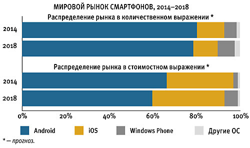 По прогнозам IDC, в 2014 году в мире будет реализовано почти 1,3 млрд смартфонов, что на 26,3% больше, чем годом ранее. Однако в наступающем году рост рынка замедлится. Количество проданных смартфонов вырастет по сравнению с 2014-м на 12,2%. В среднем же в течение четырех ближайших лет рынок будет расти только на 9,8% в год в количественном выражении. В денежном выражении из-за усиления ценовой конкуренции рост составит лишь 4,2% в год. Выход на мировой рынок китайских компаний отражается в снижении цен и повышении технических характеристик недорогих смартфонов, отмечают аналитики. В 2014 году средняя цена смартфонов составит 297 долл., а к 2018 году опустится до 241 долл. При этом на рынках развивающихся стран (например, Индии) цены будут значительно ниже — 135 долл. и 102 долл. соответственно, а на зрелых рынках существенно меняться не будут.