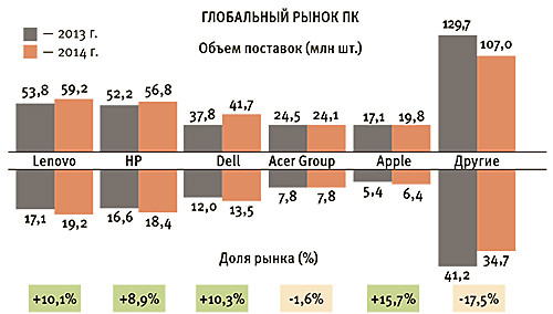 Но нет сомнений в том, что сильный финал ушедшего года задал тон для рынка ПК на нынешний. Lenovo в последнем квартале 2014 года стала лидером — компания продала 16,05 млн ПК, на 4,9% больше, чем за тот же период 2013-го. HP значительно приблизилась к возвращению себе первого места, продав 15,88 млн компьютеров, на 8,5% больше по сравнению с прошлым годом. На третьей позиции Dell, продавшая 10,88 млн ПК и прибавившая 8,5%. Acer, постепенно восстанавливающая свои позиции, нарастила поставки на 3,2%, до 6,22 млн. Apple заняла пятое место: поставки составили 5,75 млн, прирост — 18,9%. ASUS в последнем квартале прошлого года из пятерки лидеров выбыла.