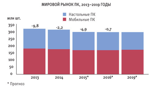 Аналитики IDC полагают, что в 2015 году продажи персональных компьютеров в мире сократятся больше, чем прогнозировалось ранее, на 4,9% вместо 3,3%. Однако прогноз на 2016-й и 2017 год стал чуть более оптимистичным. В четвертом квартале спрос на ПК оказался выше ожидаемого. Но в ближайшее время положение изменится, считают аналитики. По прогнозам, в 2015 году в мире будет реализовано 293,1 млн ПК, а в 2019-м — 291,4 млн. В денежном выражении объем рынка ПК в 2014 году составил 201 млрд долл., что на 0,8% меньше прошлогоднего. В 2015 году он уменьшится еще на 6,9%, но в последующие годы падение замедлится, и в 2019 году объем рынка составит 175 млрд долл.