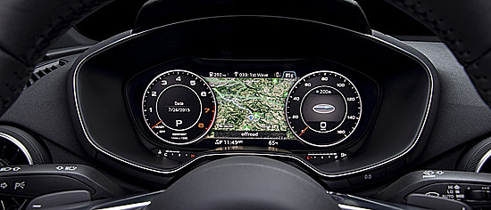 Приборная панель в Audi TT модели 2016 года будет представлять собой экран с девятью режимами работы, в которых в разных стилях отображаются либо классические приборы, либо карта, метеосводки и всевозможная дополнительная информация. Диагональ экрана 12,3 дюйма, разрешение 1440 х 540 точек. Графика на нем отображается с помощью блока Visual Computing Module, выполненного на видеочипе Nvidia Tegra 3. Частота кадров — на уровне игр для ПК, 60 fps. Еще одна параллель с компьютерами — возможность «апгрейда»: по мере выхода новых поколений оборудования VCM можно будет заменять. В автомобиле будет сразу два блока VCM от Nvidia — второй служит «движком» навигационной системы.