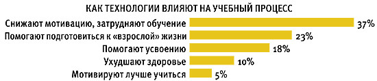 Несмотря на то что многие по-прежнему не поддерживают использование гаджетов в учебе, популярность обычных учебников снижается, показал опрос Mail.ru. Так, в прошлом году 45% опрошенных считали их наиболее полезными в учебном процессе, в этом — всего 33%. Популярность гаджетов, напротив, возросла. Больше стали ценить ноутбуки (рост с 9 до 24%) и смартфоны (с 7 до 14%). А вот планшеты, напротив, пользователи уже не считают настолько полезными в учебе: их популярность за год снизилась с 18 до 12%. Интересно, что при довольно высокой популярности обычных учебников 68% респондентов думают, что гаджеты со временем полностью их вытеснят, причем 15% пользователей утверждают, что это произойдет в ближайшие