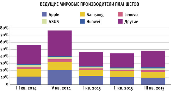 По данным аналитиков, за третий квартал в мире было реализовано 48,7 млн планшетных компьютеров. Несмотря на сезонное увеличение спроса, по сравнению с прошлым годом продажи упали на 12,6%. Возможностей для роста становится все меньше. Владельцы планшетов пользуются одним устройством в течение четырех и более лет, а с распространением смартфонов с большими экранами снижается спрос на планшеты малого формата. Apple остается лидером, несмотря на падение продаж iPad на 19,7%. Samsung благодаря интенсивному маркетингу удалось сократить отрыв и при падении продаж на 17,1% удержать 16,5% рынка. Lenovo, сохранив объем, увеличила долю до 6,3%.