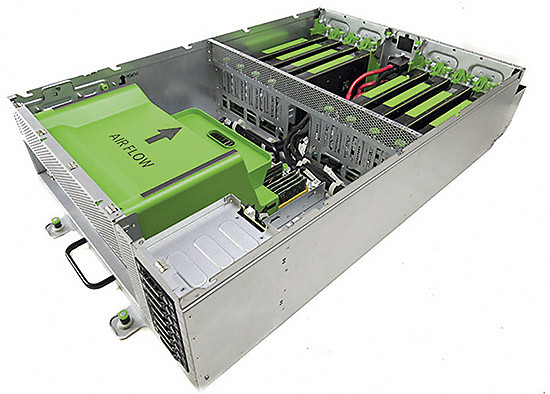 Программное обеспечение, работающее на Big Sur, активно пользуется графическими процессорами, которые нередко эффективнее центральных справляются с задачами машинного обучения. У сервера может быть до восьми высокопроизводительных видеочипов, каждый из которых потребляет до 300 Вт. Конфигурацию системы можно варьировать, соединяя компоненты с помощью шины PCIe.