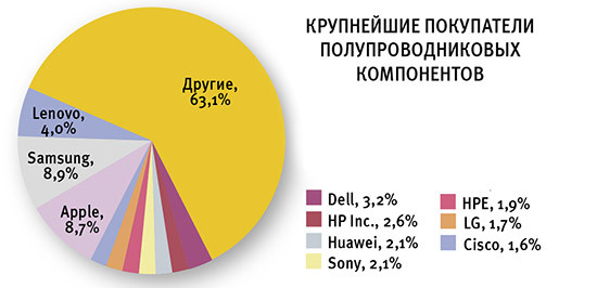 В 2015 году Samsung Electronics и Apple закупили продукции микроэлектронной промышленности на 29,8 и 29,1 млрд долл. соответственно. При этом, однако, Samsung в 2015 году снизила объем закупок на 3,6% по сравнению с 2014-м, а Apple увеличила его на 7,1%. Lenovo, которая вместе с Samsung в последние пять лет лидировала по скорости роста потребления, сократила закупки на 3%. Аналитики полагают, что риск снижения потребления микроэлектронной продукции ведущими компаниями увеличивается. В связи с этим многие производители стремятся сократить зависимость от крупных заказчиков и диверсифицировать продажи. В целом же объем мирового рынка полупроводниковых компонентов в 2015 году упал на 1,9% до 333,718 млрд долл.