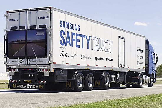 Первый грузовик Samsung Safety Truck с экраном, показывающим едущим сзади водителям обстановку на дороге впереди, выйдет на дороги Аргентины уже в этом году. Samsung Safety Truck представляет собой тягач Volvo FH, оборудованный спереди двумя видеокамерами, передающими изображение на большой экран сзади, состоящий из четырех светодиодных панелей Samsung OH46D диагональю 46 дюймов и разрешением 1920 на 1080 точек. Мониторы серии OHD обладают защитой от пыли и воды уровня IP56 и должны обеспечивать работу в любых погодных условиях. Испытания «прозрачного» грузовика будут идти в течение года, но компания Samsung в ближайшее время не планирует начинать производство подобных систем.