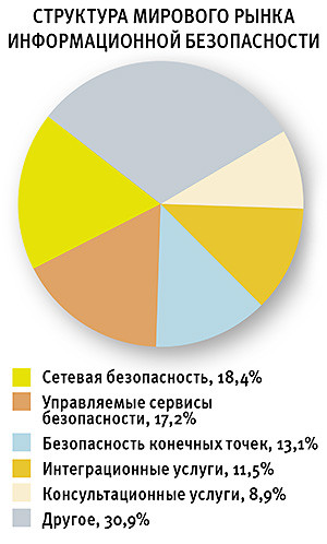 Самым крупным сегментом рынка в ближайшие годы будут услуги — в первую очередь управляемые сервисы безопасности, а также интеграционные и консультационные услуги. На них в 2017 году приходится почти 31,2 млрд долл. Размер сегмента аппаратных и программных средств сетевой безопасности в 2017 году составит 15,2 млрд долл., а средств безопасности конечных точек — 10,2 млрд долл. Активно развиваются сегменты программных средств оценки уязвимости оборудования (на 16% в год) и программ (14,5% в год), управляемых сервисов безопасности (12,2% в год), анализа поведения пользователей (12,2% в год) и интегрированных устройств управления безопасностью (Unified Threat Management, UTM) — 11,9% в год.