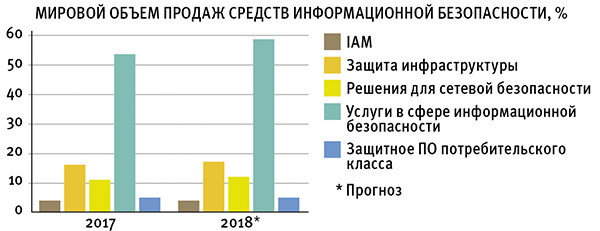 По прогнозам аналитиков, мировой объем продаж средств информационной безопасности (средств управления доступом и идентичностью, защиты инфраструктуры, оборудования для сетевой безопасности, услуг, а также ПО потребительского класса) в 2018 году вырастет на 8% по сравнению с 2017 годом и достигнет 96,3 млрд долл. Увеличение расходов на средства безопасности в значительной степени связано с недавними громкими случаями утечки данных из-за кибератак. Именно поэтому среди сегментов рынка быстрее других будут расти сегменты средств тестирования безопасности, ИТ-аутсорсинга и систем управления информацией о безопасности и событиями безопасности (SIEM). Соответствующие вложения также стимулируются новыми законами о защите данных. Дефицит специалистов, техническая сложность и характер угроз подталкивают компании к внедрению средств автоматизации и переходу на аутсорсинг. В 2018 году расходы на аутсорсинговые услуги в области безопасности вырастут в мире на 11%, до 18,5 млрд долл., полагают аналитики, а к 2019 году их доля в корпоративных бюджетах информационной безопасности вырастет до 75% с 63% в 2016 году.