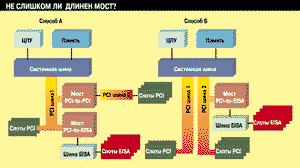 Способ использования мостов может оказать существенное влияние на суммарную производительность системы. Для примера рассмотрим Рис. 1, где показаны два способа соединения нескольких шин мостами. Способ А соответствует каскадному соединению, где шина PCI2 подключена к шине PCI1 при помощи моста между PCI и PCI. Шина EISA, в свою очередь, также подключена к шине PCI1. В соответствии с каскадной структурой системы, все данные, направляющиеся к любому из адаптеров или от любого из адаптеров, подключенных к слоту PCI или EISA, должны пройти через шину PCI1. Тем самым, верхний предел пропускной способности ввода/вывода системы в целом составляет 132 Мбайт/с.