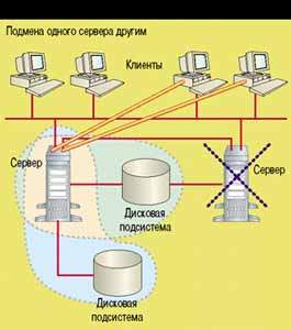ними и отдельным дисковым массивом. В случае сбоя оставшийся сервер берет